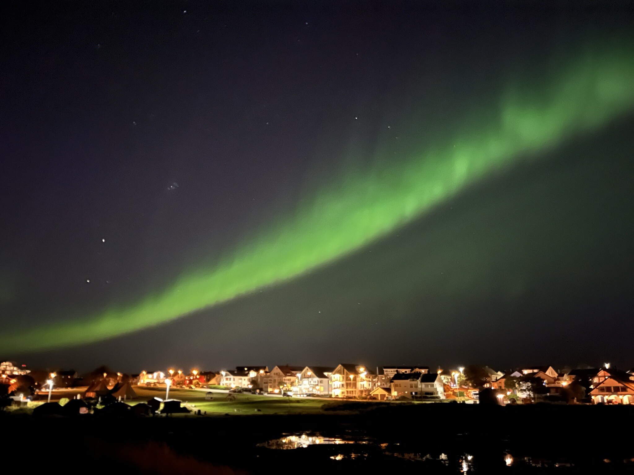 Zilona zorza polarna nad oświetlonym miasteczkiem.