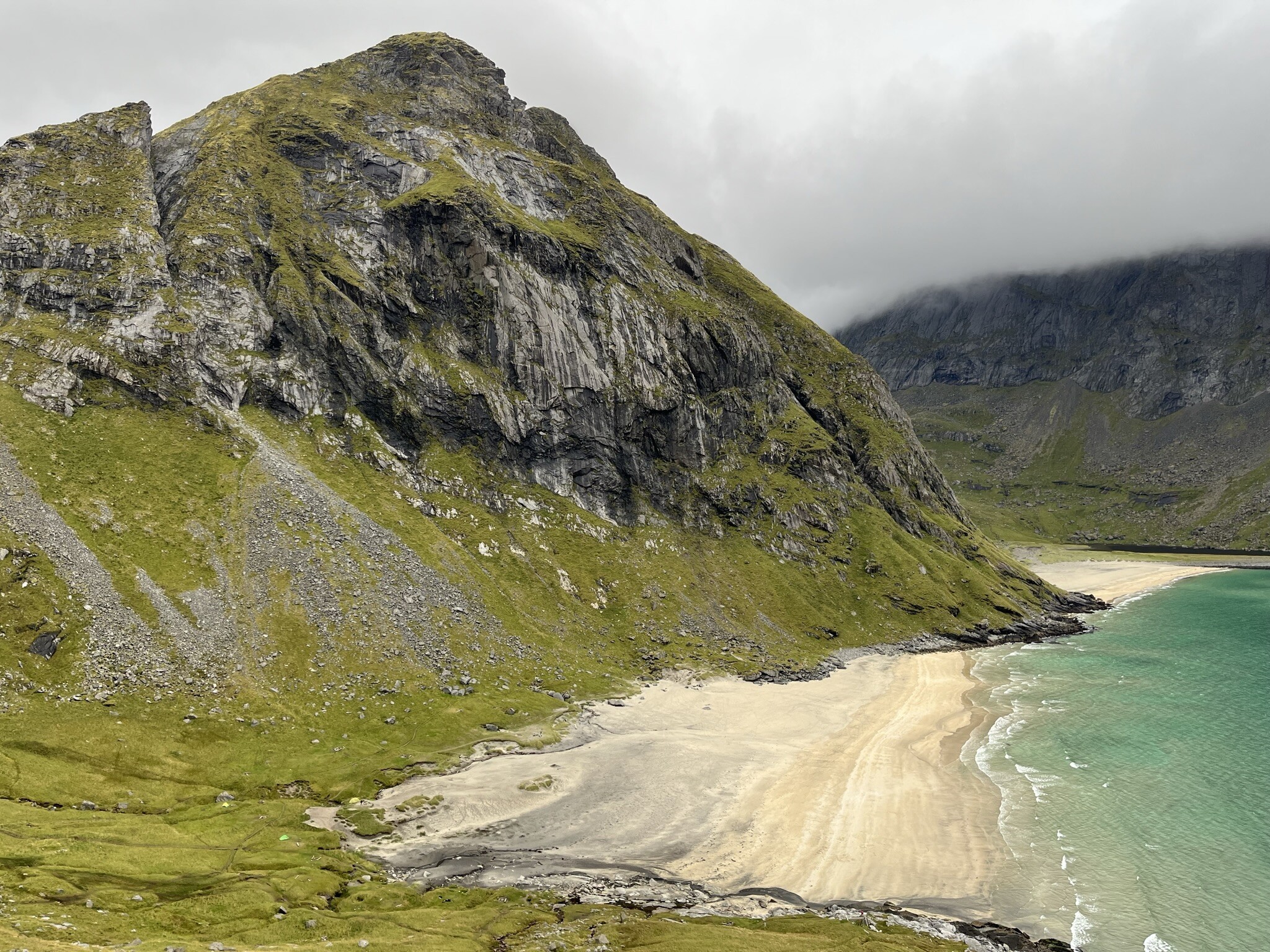 Góry skaliste, z zieloną trawą, po prawej stronie brzeg wody. W oddali chmury.