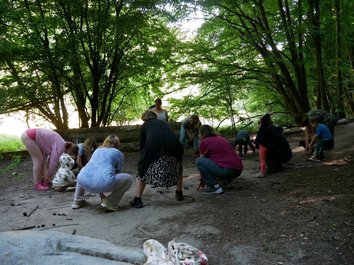 Zdjęcie przedstawia grupę osób – dorosłych i dzieci – pochylających się ku ziemi w lesie,  biorących udział w warsztatach ruchowych na świeżym powietrzu. Uczestnicy są skupieni, wykonują synchroniczny ruch, jakby coś zbierali lub dotykali ziemi.
