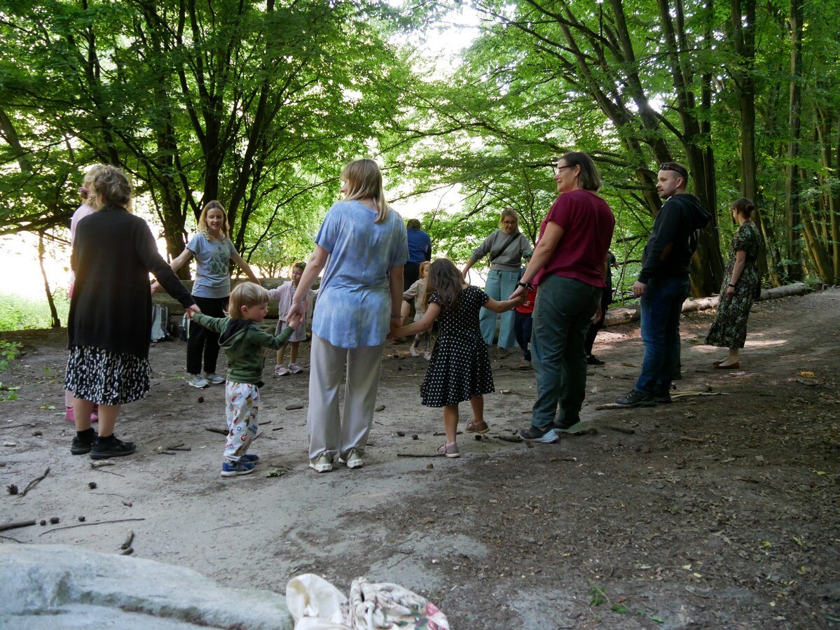 Zdjęcie przedstawia grupę ludzi trzymających się za ręce i stojących w kręgu w lesie, na leśnej polanie otoczonej drzewami. W kręgu uczestniczą zarówno dorośli, jak i dzieci, co nadaje scenie rodzinny i integracyjny charakter. W tle widoczne są
