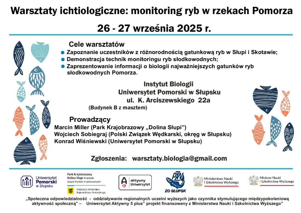 Zapraszamy na warsztaty ichtiologiczne organizowane przez Uniwersytet Pomorski we współpracy z Parkiem Krajobrazowym "Dolina Słupi" oraz Zarządem Okręgu Polskiego Związku Wędkarskiego w Słupsku. Warsztaty adresowane są do pracowników instytucji państwowych zajmujących się przyrodą, uczniów i nauczycieli szkół podstawowych i średnich, studentów i miłośników przyrody.