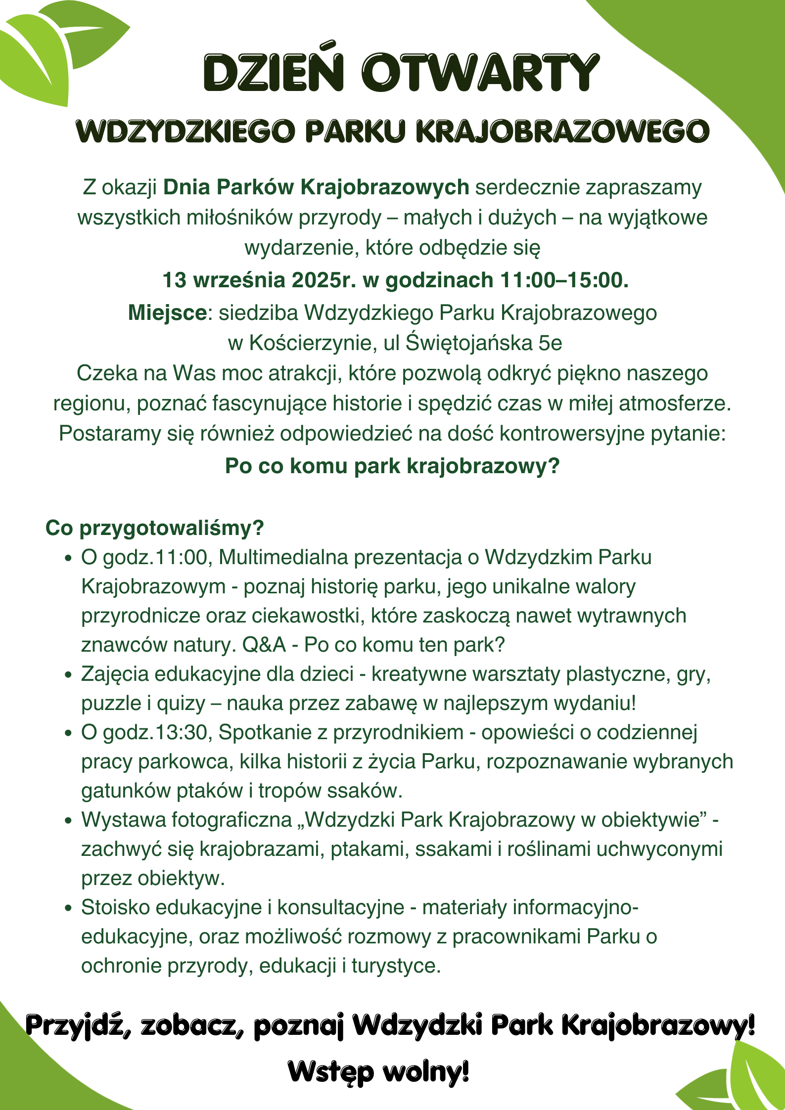 Z okazji Dnia Parków Krajobrazowych serdecznie zapraszamy wszystkich miłośników przyrody – małych i dużych – na wyjątkowe wydarzenie, które odbędzie się 13 września 2025r. w godzinach 11:00–15:00.