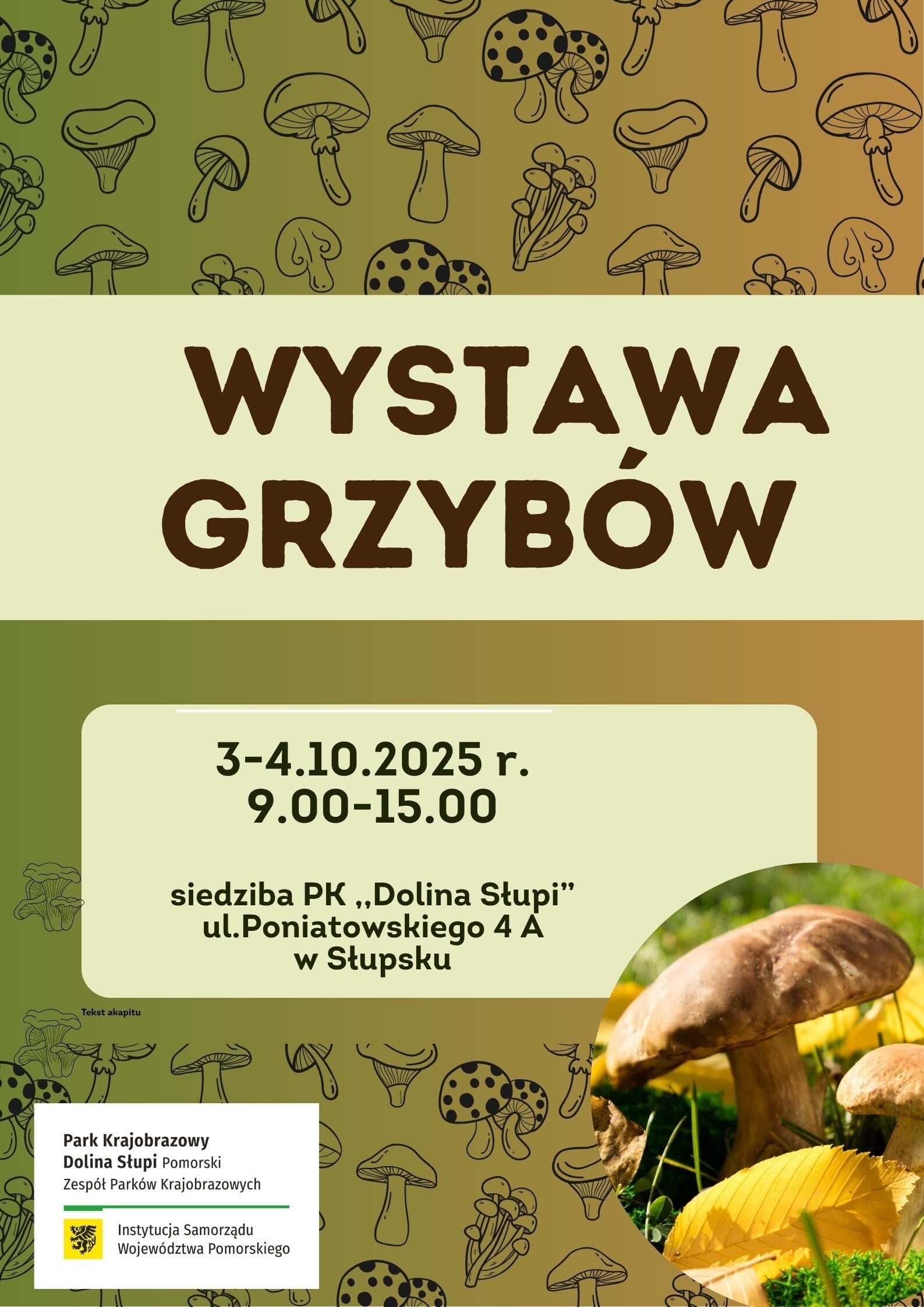 Pomorski Zespół Parków Krajobrazowych Oddział Park Krajobrazowy „Dolina Słupi” organizuje w dniach 3 i 4.10.2025 roku wystawę grzybów. Zapraszamy Państwa w godzinach 9.00-15.00 do siedziby Parku Krajobrazowego „Dolina Słupi” przy ul. Poniatowskiego 4A Wystawa zostanie zorganizowana w plenerze od strony ul. Poniatowskiego (przy niesprzyjającej pogodzie w budynku). Celem wystawy jest przedstawienie gatunków grzybów rosnących na naszym terenie, zaprezentowanie ich roli w przyrodzie oraz różnorodności tej grupy niezwykle ciekawych organizmów. Na wystawie zaprezentujemy modele i naturalne okazy grzybów jadalnych, niejadalnych i trujących oraz zdjęcia gatunków rzadkich i objętych ochroną. Podpowiemy jak prawidłowo przygotować się do grzybobrania i nie popełnić błędu przy zbiorze.