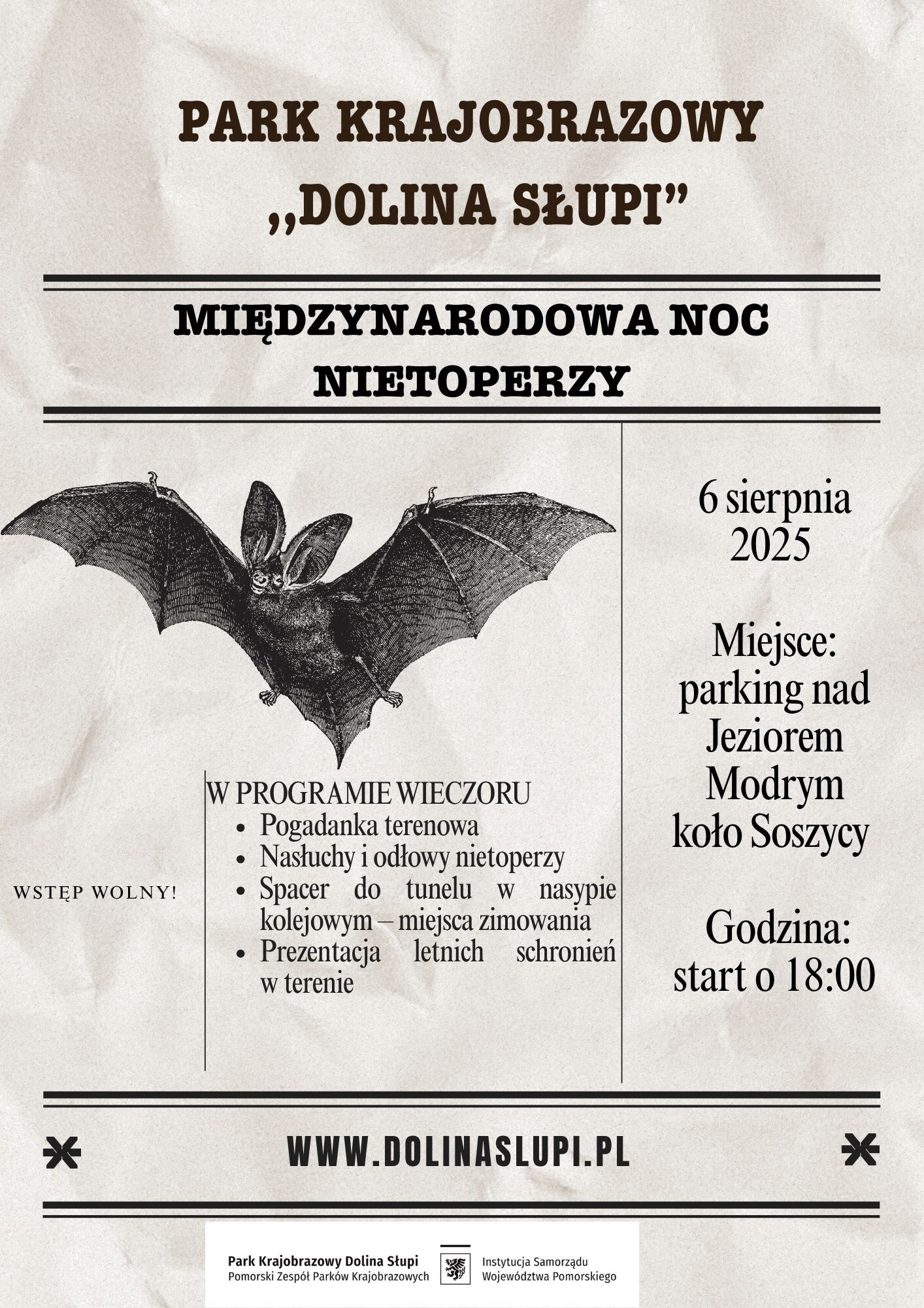 Zapraszamy na spotkanie z nietoperzami, tym razem spotkamy się na parkingu nad Jeziorem Modrym, przy drodze Soszyca-Łupawsko. Startujemy 6 sierpnia 2025 roku o godz. 18.00. https://maps.app.goo.gl/5ewALsNJGmdhchSy9